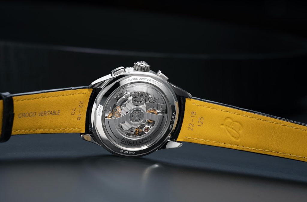 Beneath the 42-millimeter stainless steel exterior lies the 1:1 fake Breitling Manufacture Caliber B25, a COSC-certified chronometer that orchestrates a complex symphony of time. The dial balances intricacy with clarity, displaying day, date, and month alongside a poetic moon-phase indicator. To ensure its status as a collector’s object, the steel caseback is engraved with “ONE OF 60” and “DIAMOND JUBILEE EDITION,” securing each watch as a numbered tribute to this historic year.