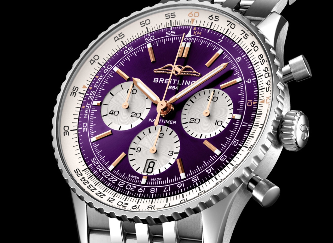 The 50-piece run retains the classic Navitimer design featuring the hallmark slide rule bezel, but with a striking dial in satiné translucid purple, essentially translucent lacquer. The purple dial is matched with red gold appliqués that include the high quality Breitling clone watches emblem, contrasting against the dial’s vibrant hue.